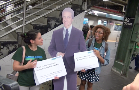 At Grand Central Terminal on February 3, the Riders Alliance trotted out its “Cardboard Cuomo” — a PR gambit the group has used in the past to press the governor on mass transit issues — to draw commuters’ attention to the budget issue. “Cardboard Cuomo,” the group said, “‘apologized’ for his inaction on the MTA Capital Plan.”