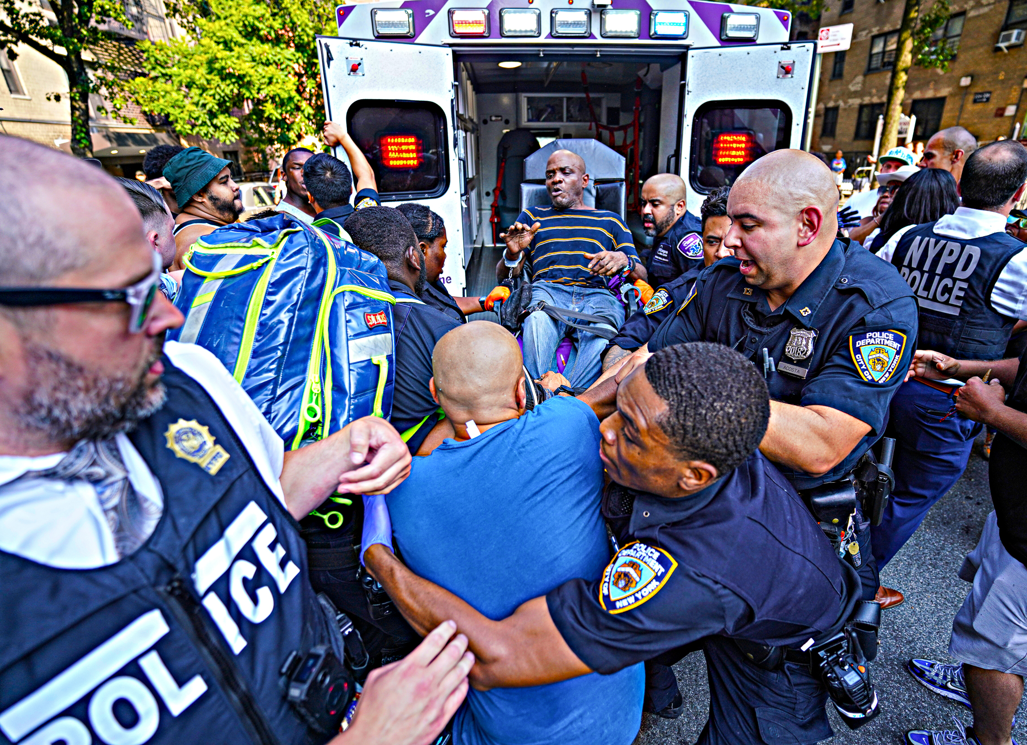 Both the cops and the paramedics were able to shove the suspected killer into the back of the ambulance, but not before he was struck several more times. The group then banged their closed fists on the vehicle before it sped away.