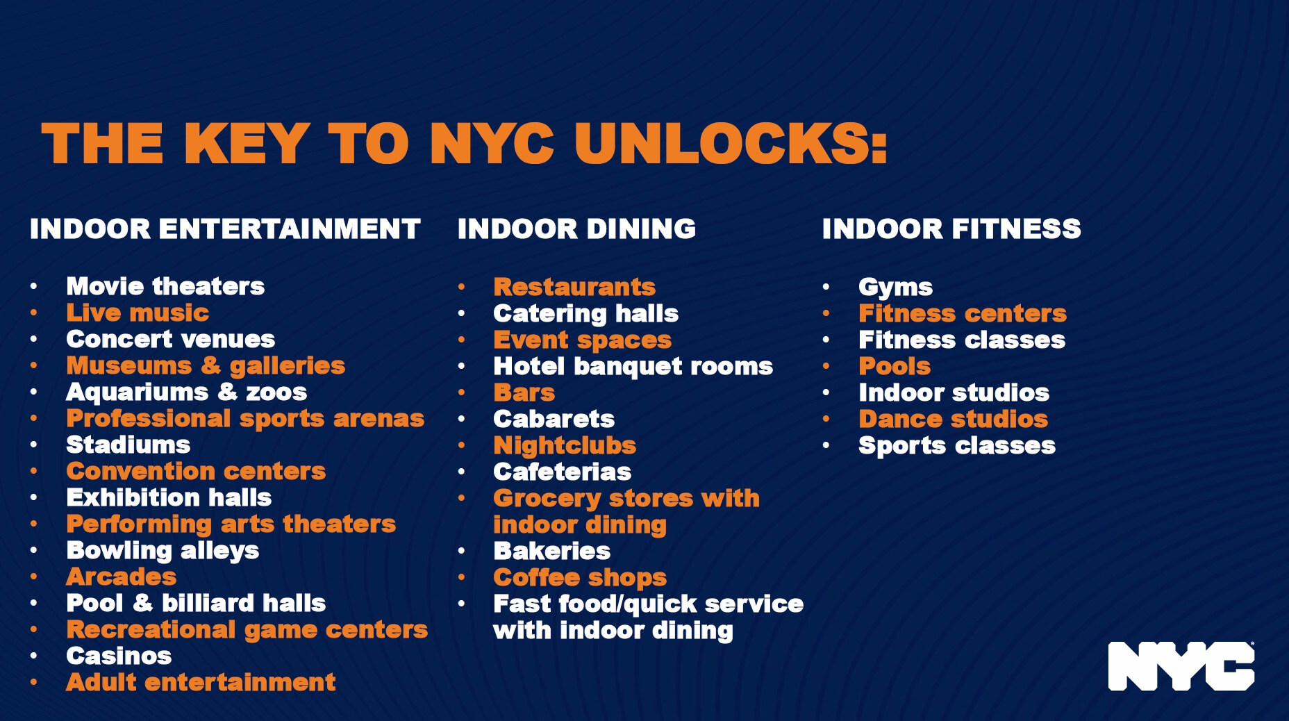 De Blasio said New Yorkers could show proof with the paper card, the Excelsior Pass, or the NYC COVID SAFE app. New Yorkers will be able to work or enjoy indoor dining and venues if they have at least the first vaccination.