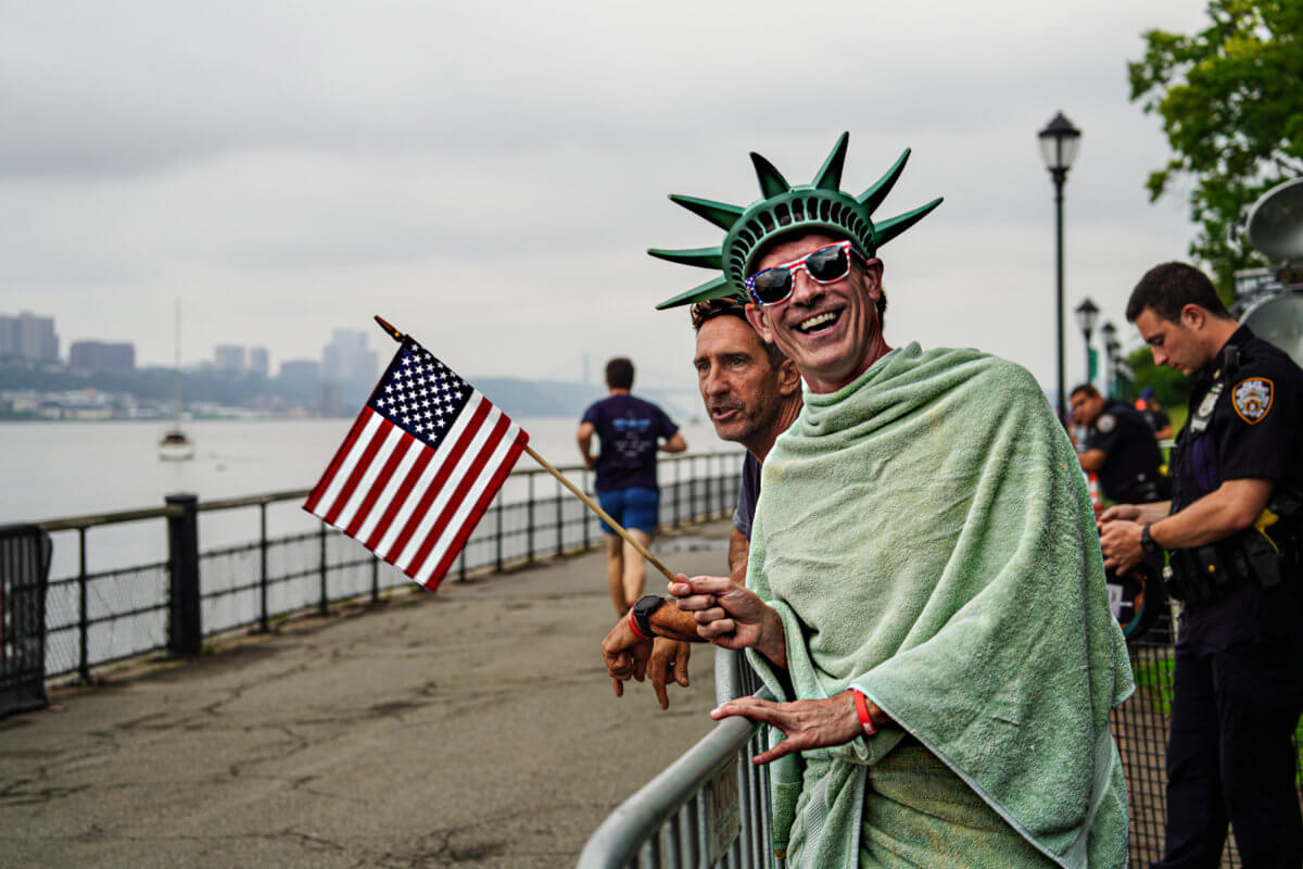 Along the way. supporters lined the Central Park West roadways to cheer on athletes with signs and bells as they made the grueling trek toward the finish line located at the Naumburg Bandshell.