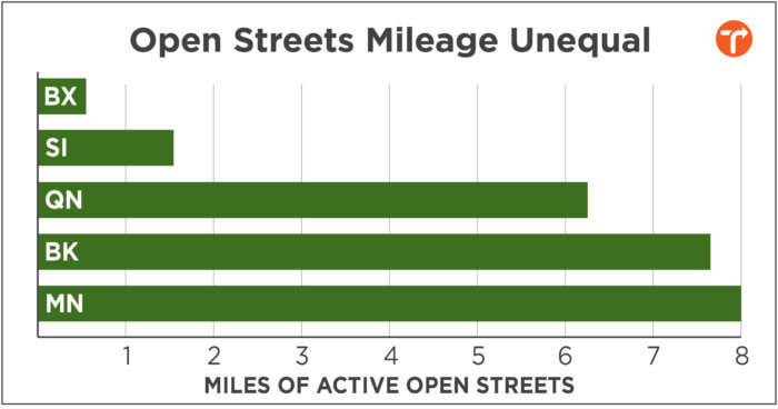 The active rates vary widely by borough, with Manhattan boasting 8.06 miles of actually open Open Streets, or 66% of its share, while The Bronx had a meagre 0.53 miles, or 16%.