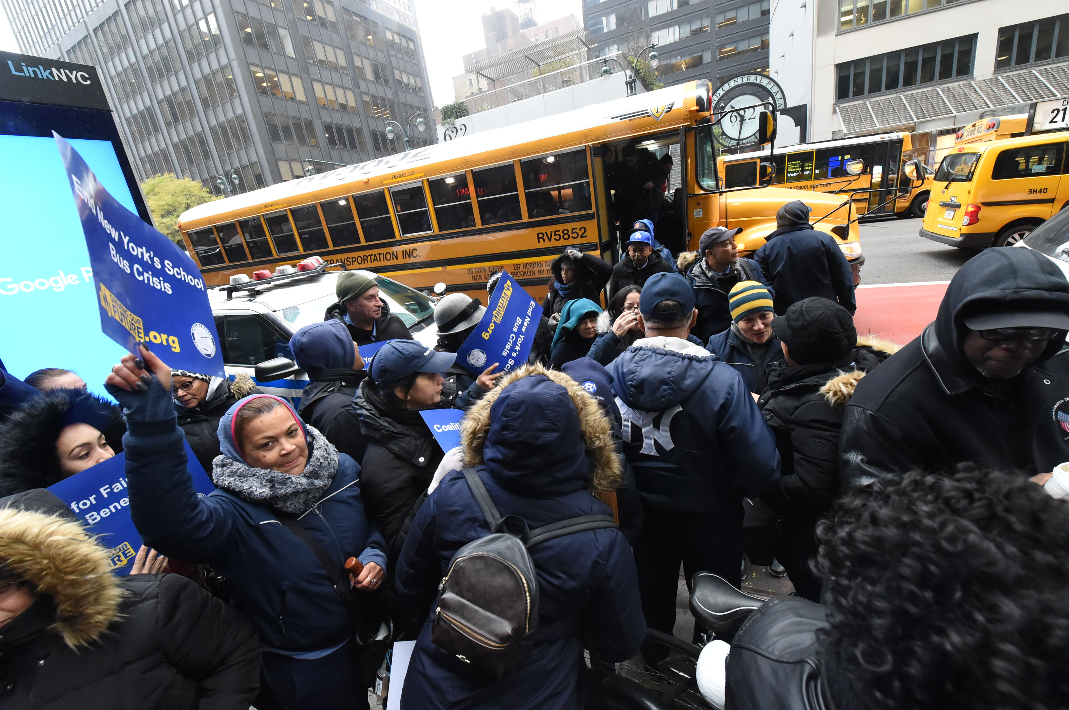 Hundreds of school bus drivers and monitors rallied in front of Governor Andrew Cuomo’s Manhattan office Monday morning, calling on him to sign the “Employee Protection Provision” (EPP) bill that they say would ensure drivers seniority, fair wages and benefits, regardless of company turnover.