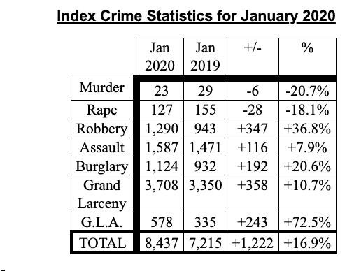 However, some major indexes dropped including hate crimes which decreased by 24 percent, homicides are down 20.7 percent from last year – after last year’s increase in those crimes caused alarm among law enforcement officials. Rape reports have also dropped just over 28 percent this month with 127 cases reported compared with 155 last year – though officials believe this crime has been historically under reported by victims.