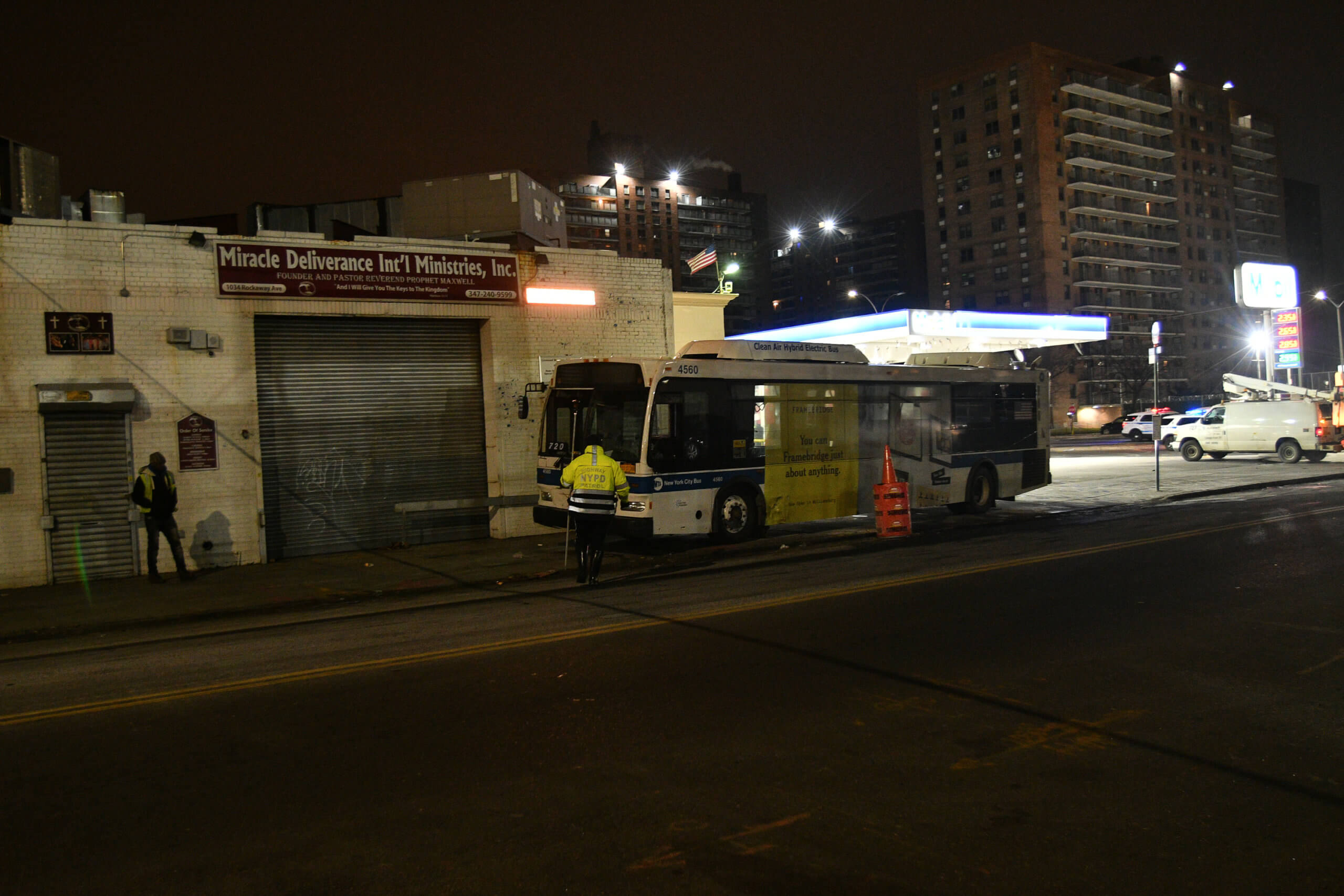 The vehicle then slammed into a B60 bus traveling southbound along Rockaway Avenue. Just two people were riding the bus with the driver at the time of the crash.