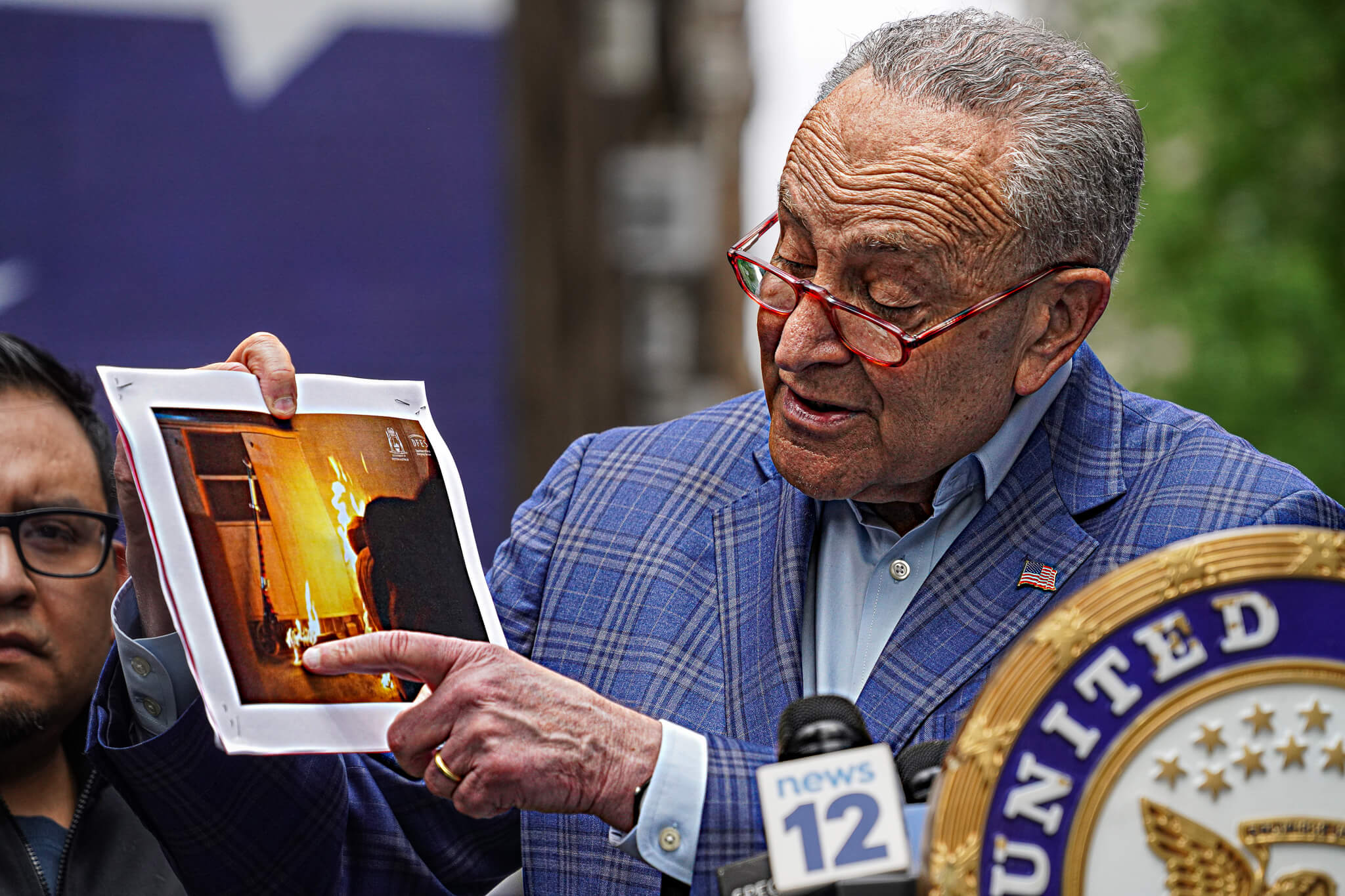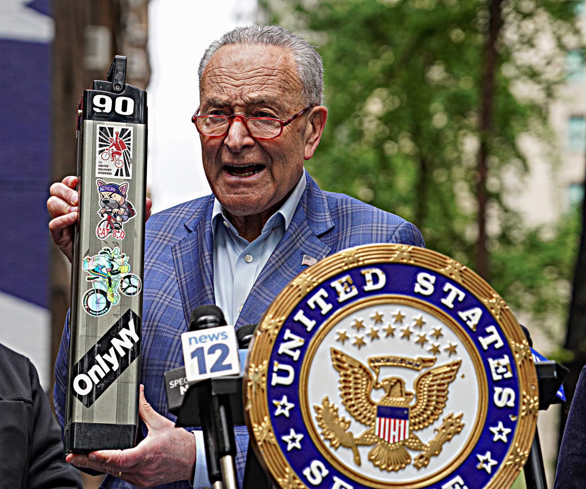 “Over the past few years, there has been a growing number of fires across New York City, in Long Island and beyond,” Schumer said, lifting a Lithium-ion battery. “This is one of these batteries. They’re heavy. They’re important. They catch on fire. That’s the problem. And if you’re riding on a scooter or a bike, or even have it stored in your home, and this catches on fire, you are in big, big trouble.”