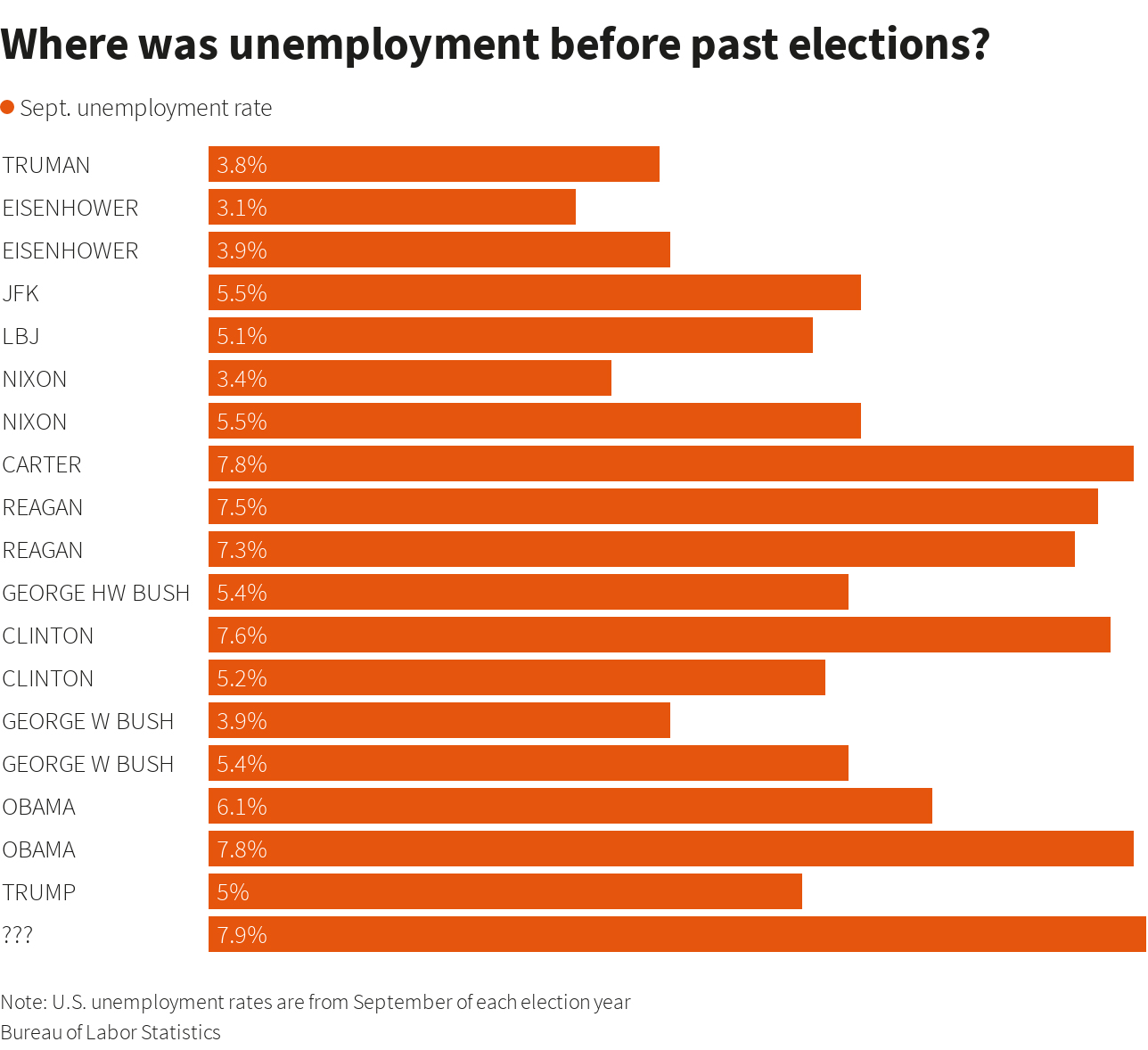 The jobless rate was nearly as high as it is now when voters picked Jimmy Carter, a Democrat, over Republican President Gerald Ford in 1976, when Carter lost to Republican challenger Ronald Reagan in 1980, and when Democratic Arkansas Governor Bill Clinton ousted Republican President George H.W. Bush in 1992.