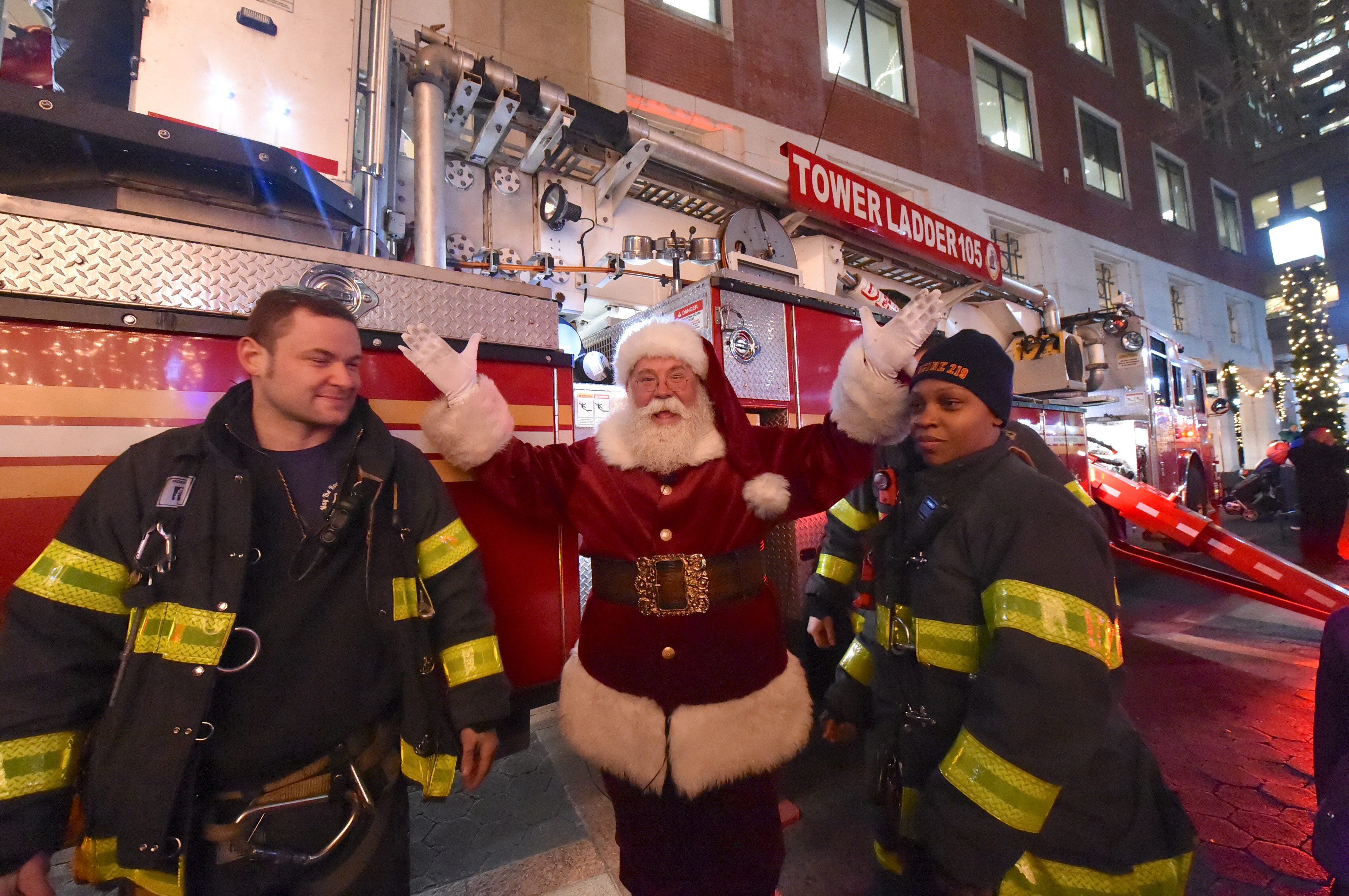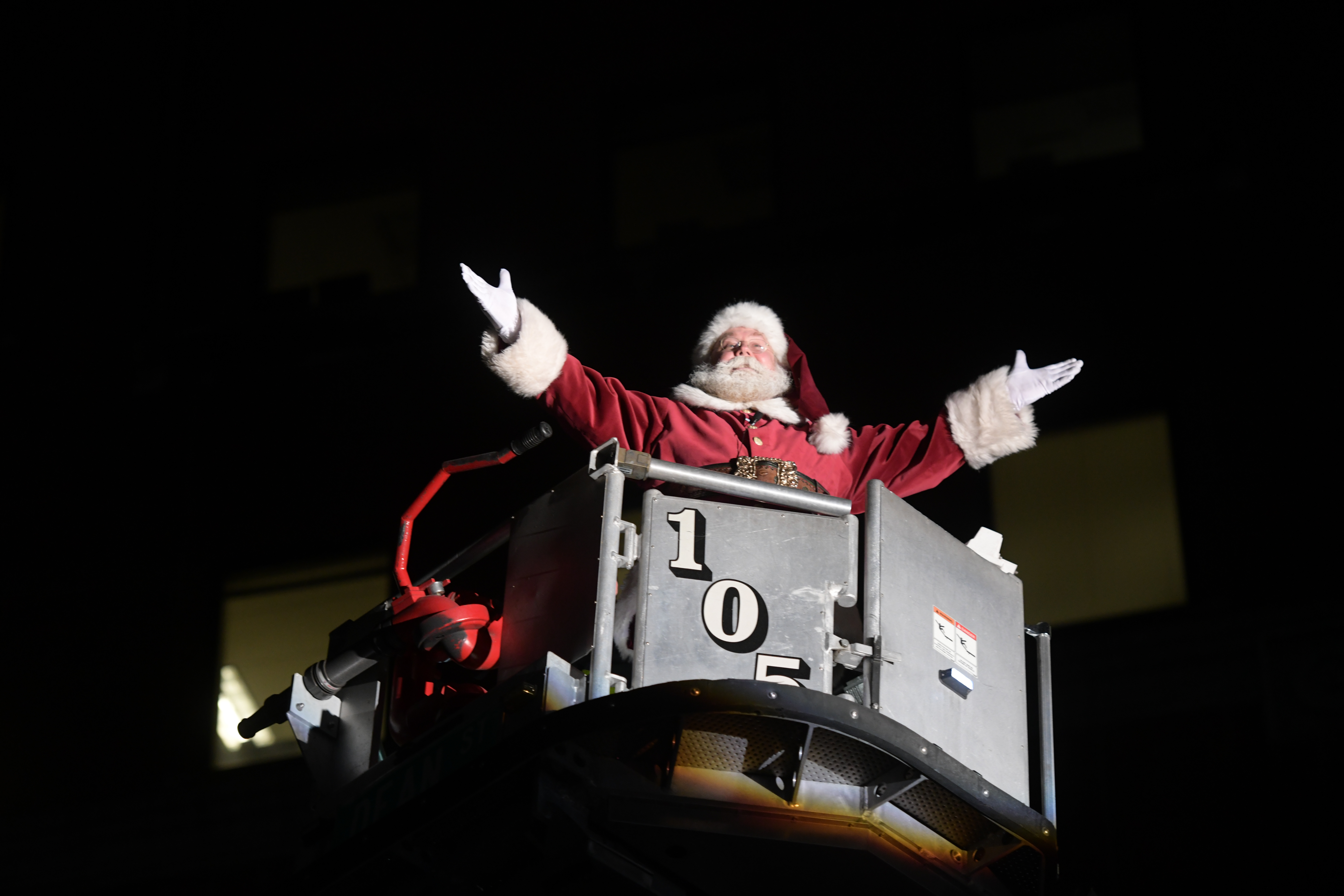 Santa Claus came to town, seemingly flying above the Metrotech Christmas tree, but in a fire department bucket truck to the delight of residents and children massed below Wednesday night.